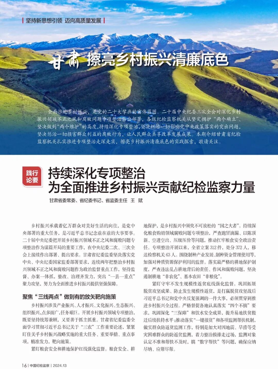 乡村振兴承载着亿万群众对美好生活的向往,是党中央部署的重大任务,是习近平总书记念兹在兹的大事要事。二十届中央纪委把开展乡村振兴领域不正之风和腐败问题专项整治作为谋篇开局的重要工作,在中央纪委二次、三次全会上接续作出部署、提出要求。甘肃省纪委监委坚决落实党中央、中央纪委国家监委部署要求,连续两年把整治乡村振兴领域不正之风和腐败问题作为政治监督重点工作,坚持监督、办案一体抓,整改、治理齐发力,突出“一县一重点”聚力攻坚,努力为全面推进乡村振兴提供坚强保障。