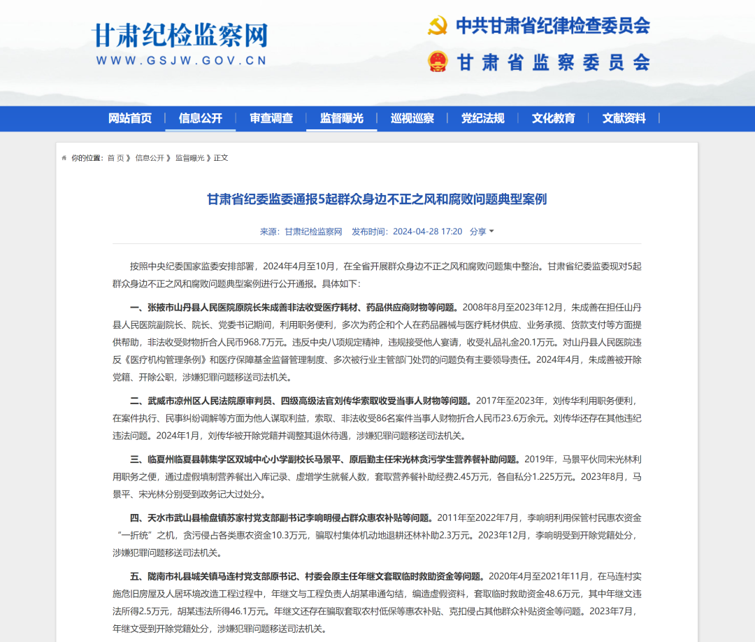 “临夏县韩集学区双城中心小学副校长马某、原后勤主任宋某贪污学生营养餐补助”,“武山县榆盘镇苏家村党支部副书记李某侵占群众惠农补贴”,“礼县城关镇马连村党支部原书记、村委会原主任年某套取临时救助资金”……4月28日,甘肃省纪委监委公开通报5起群众身边不正之风和腐败问题典型案例,其中多起涉及乡村振兴领域,为全省党员干部敲响警钟。